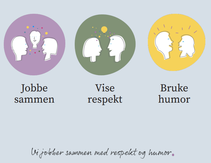 Vi behandler brukere, kolleger og andre vi kommer i kontakt med gjennom arbeid eller arbeidsrelaterte aktiviteter, med høflighet og respekt for hverandres erfaring og kompetanse. Vi er åpne og tydelige, samt bidrar til gode løsninger.