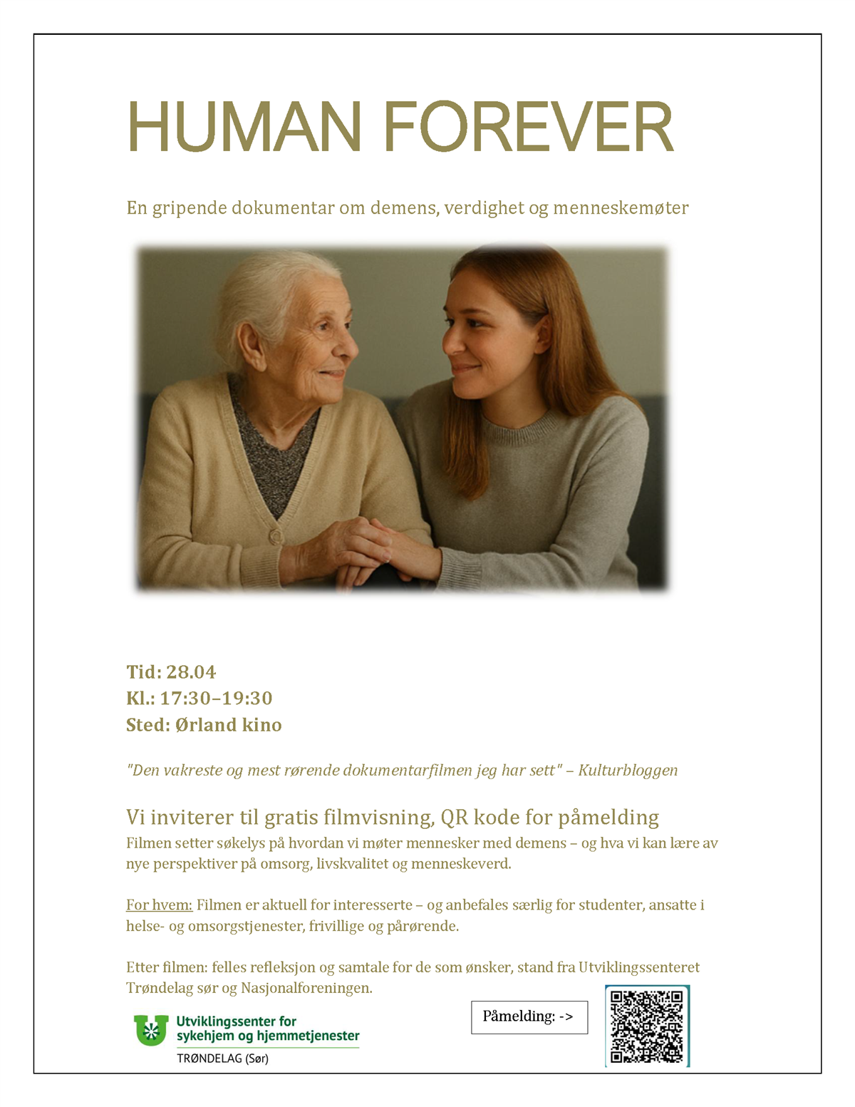 En gripende dokumentar om demens, verdighet og menneskemøterUSHT inviterer til gratis filmvisning, QR kode for påmelding. Publisert av Elisabet B. Karlsaune Sist endret 16.04.2026 11:47