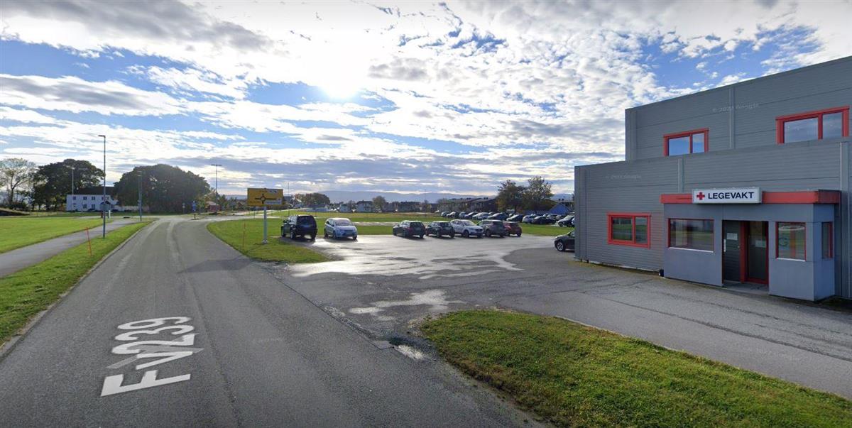 Når du kommer langs Skolegata, ligger legevakta til høyre for rundkjøringen.